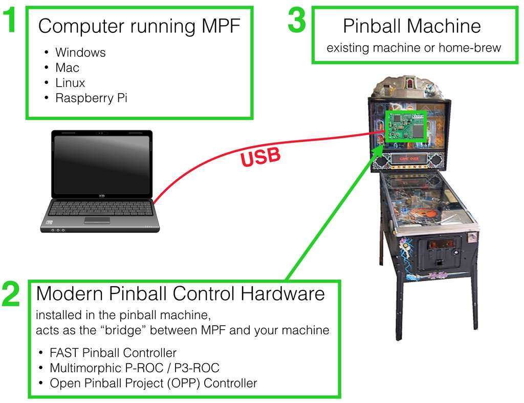 Usage of Mission Pinball Framework open source software. There are multiple Control Hardware options available which are compatible with the MPF.